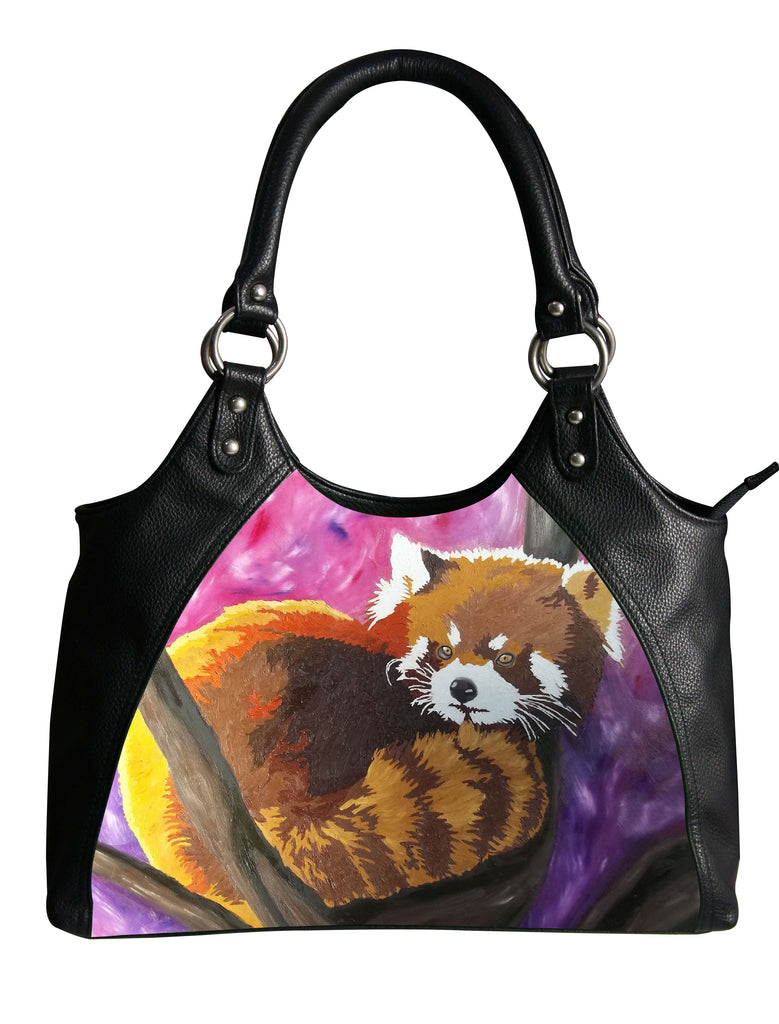 Our Retro Cat vegan red panda leather bag is fashion forward, versatile, and stylish, It purrfect for an everyday purse. The straps are large enough to wear over the shoulder. The straps and outer portions are made of high-quality vegan leather in black, while the center portion containing the print is made of water resistant microfiber. The microfiber allows for our signature images, taken from original oil paintings, to pop with dynamic color and vibrancy. They feature over-sized silver-tone hardware and multiple pockets. Butter soft vegan leather, double vegan leather shoulder strap, microfiber front, zip top closer, outside zip compartment, large silver-tone hardware, polyester lining, inside zip pocket, cell phone pocket. 12 x 15 x 4 inches, 30 x 38 x 10 cm