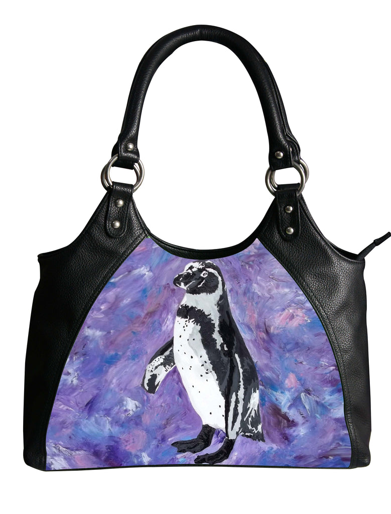 Our Retro Cat vegan leather penguin bag is fashion forward, versatile, and stylish, It purrfect for an everyday purse. The straps are large enough to wear over the shoulder. The straps and outer portions are made of high-quality vegan leather in black, while the center portion containing the print is made of water resistant microfiber. The microfiber allows for our signature images, taken from original oil paintings, to pop with dynamic color and vibrancy. They feature over-sized silver-tone hardware and multiple pockets. Butter soft vegan leather, double vegan leather shoulder strap, microfiber front, zip top closer, outside zip compartment, large silver-tone hardware, polyester lining, inside zip pocket, cell phone pocket. 12 x 15 x 4 inches, 30 x 38 x 10 cm