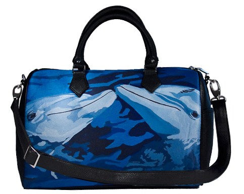 Our butter soft vegan leather dolphin bag is the ultimate in luxury for all those posh kittens out there. It features a detachable shoulder strap that is also adjustable for versatility. It has a footed bottom, protecting it from dirt and from getting torn when set down, and which also keeps the bag upright and maintains it shape when set down. Zippered compartments inside allows for easy organization. It is made of an ultra-sturdy water-resistant microfiber which allows for the image, taken from original oil paintings to pop with amazing detail and color. Butter soft vegan leather,detachable adjustable vegan leather shoulder strap, vegan leather handles with whip detail, double sided microfiber print, zip top closer, two outside pockets, silver-tone zipper pull polyester lining, inside zip pocket, cell phone pocket, footed bottom.
