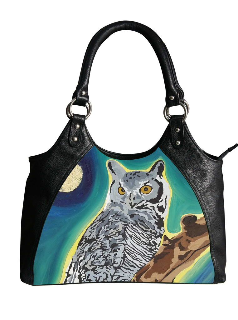 Our Retro Cat vegan leather owl bag is fashion forward, versatile, and stylish, It purrfect for an everyday purse. The straps are large enough to wear over the shoulder. The straps and outer portions are made of high-quality vegan leather in black, while the center portion containing the print is made of water resistant microfiber. The microfiber allows for our signature images, taken from original oil paintings, to pop with dynamic color and vibrancy. They feature over-sized silver-tone hardware and multiple pockets. Butter soft vegan leather, double vegan leather shoulder strap, microfiber front, zip top closer, outside zip compartment, large silver-tone hardware, polyester lining, inside zip pocket, cell phone pocket. 12 x 15 x 4 inches, 30 x 38 x 10 cm