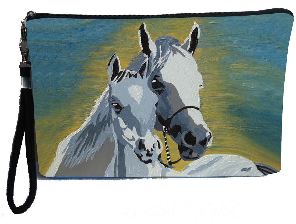 Our purrfect horse pouch can do just about anything! If you don’t want to carry a purse, the detachable strap will hold all of your essentials in an easy to carry pouch. It large enough to carry brushes and any makeup, so it great for travel or just being put into a purse for organization. And parents, what a great way to keep your kitten snacks, crayons, and the like all close at hand. Double Sided Print Water Resistant Microfiber Foam padding zip top closer detachable polyester strap silver-tone zipper pull with detachable signature charm polyester lining. 10 x 6 in, 25.5 x 16 x 3 cm