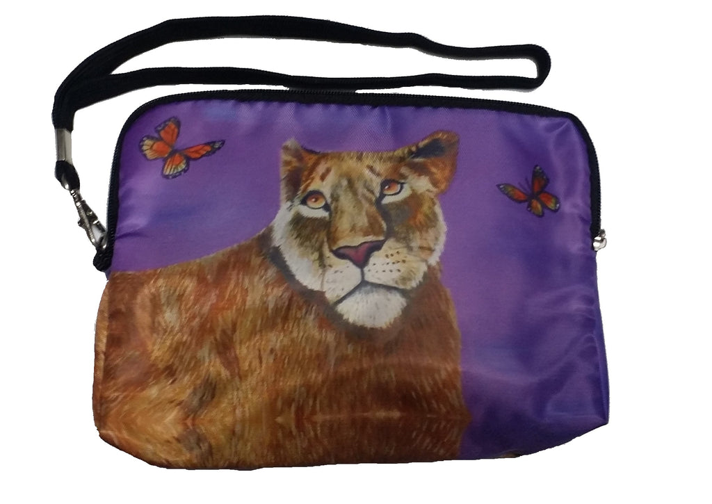 Our signature lioness wristlet is a stylish way to carry all of your essentials, including most phones. The wristlet has a zip around closer and an ultra-sturdy detachable wrist strap. It can be easily spot cleaned and the inside is lined with a lavender microfiber. Each wristlet comes with our signature detachable charm and hang-tag! Double Sided Print, Polyester, Zip around closer, Detachable signature zipper charm, Detachable polyester strap is 10 inches in length, lavender microfiber lining. 6.7 x 4.7 x 1.5 inches, 17 x 12x 4 cm not including strap
