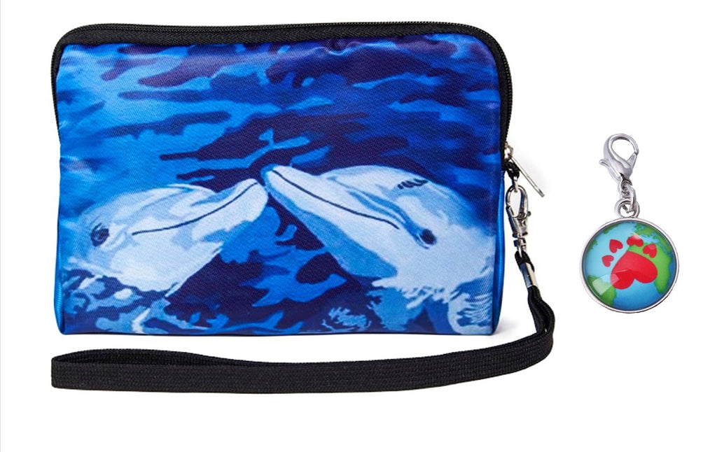 Our signature dolphin wristlet is a stylish way to carry all of your essentials, including most phones. The dolphin wristlet has a zip around closer and an ultra-sturdy detachable wrist strap. It can be easily spot cleaned and the inside is lined with a lavender microfiber. Each wristlet comes with our signature detachable charm and hang-tag! Double Sided Print, Polyester, Zip around closer, Detachable signature zipper charm, Detachable polyester strap is 10 inches in length, lavender microfiber lining. 6.7 x 4.7 x 1.5 inches, 17 x 12x 4 cm not including strap