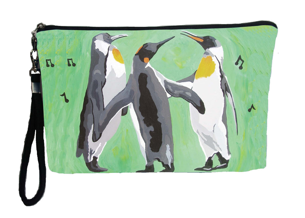 Our purrfect penguin pouch can do just about anything! If you don’t want to carry a purse, the detachable strap will hold all of your essentials in an easy to carry pouch. It large enough to carry brushes and any makeup, so it great for travel or just being put into a purse for organization. And parents, what a great way to keep your kitten snacks, crayons, and the like all close at hand. Double Sided Print Water Resistant Microfiber Foam padding zip top closer detachable polyester strap silver-tone zipper pull with detachable signature charm polyester lining. 10 x 6 in, 25.5 x 16 x 3 cm