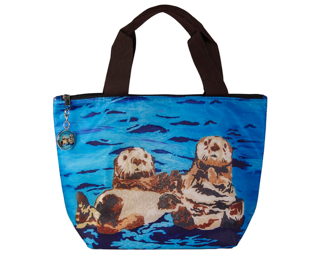 Keep your food and drinks fresh in style with our sea otter lunch bag. Suitable for meals, snacks, or drink, the lunch bag insulated so cold and warm items stay warm. Take your goodies to school or work in unique and artistic style Polyester, Fully insulated, silver foil lining, zip top closer, polyester double handle, Silver-tone zipper, matching detachable zipper charm.