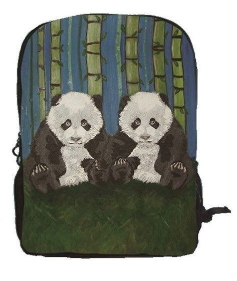 Our panda cubs book bag has water resistant microfiber, foam padding, two outside compartments with zippers, two silver circle zipper pulls, adjustable shoulder straps 38-70 ...