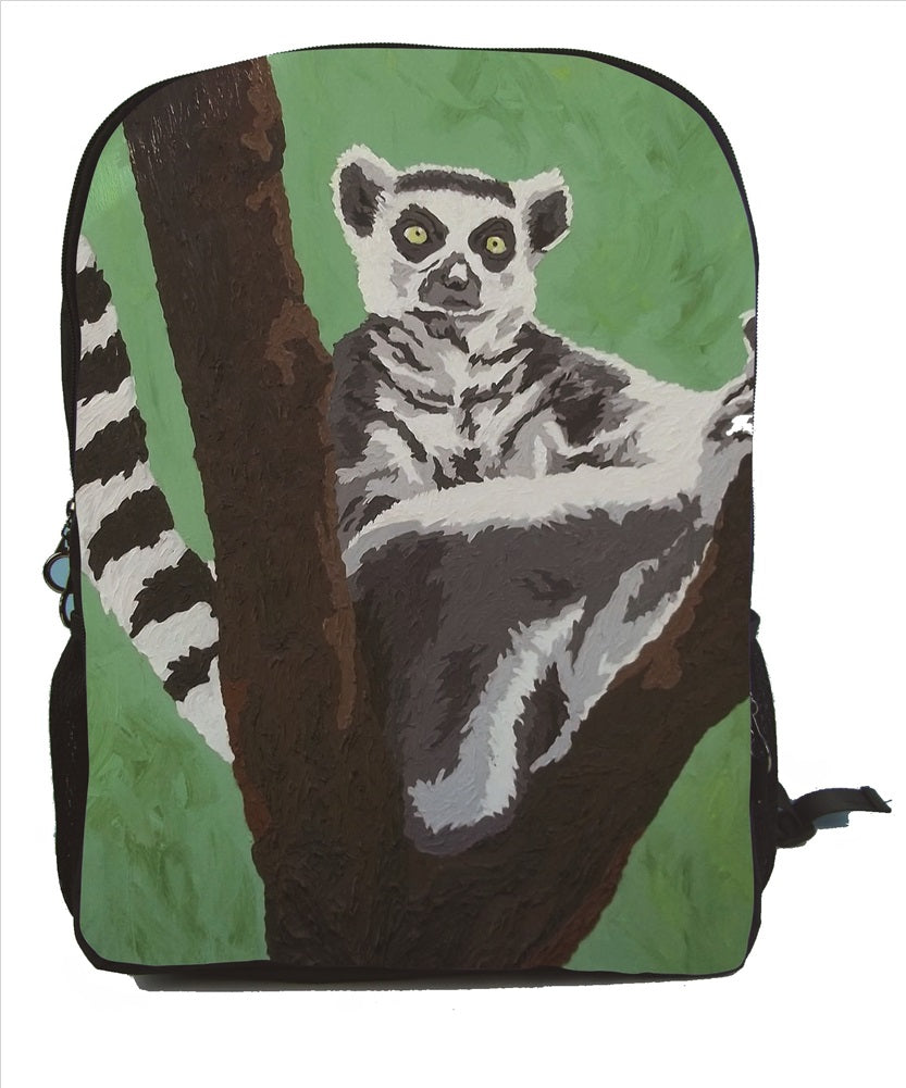 Our lemur book bag features water resistant microfiber, foam padding, two outside compartments with zippers, two silver circle zipper pulls, adjustable shoulder straps 38-70 ...